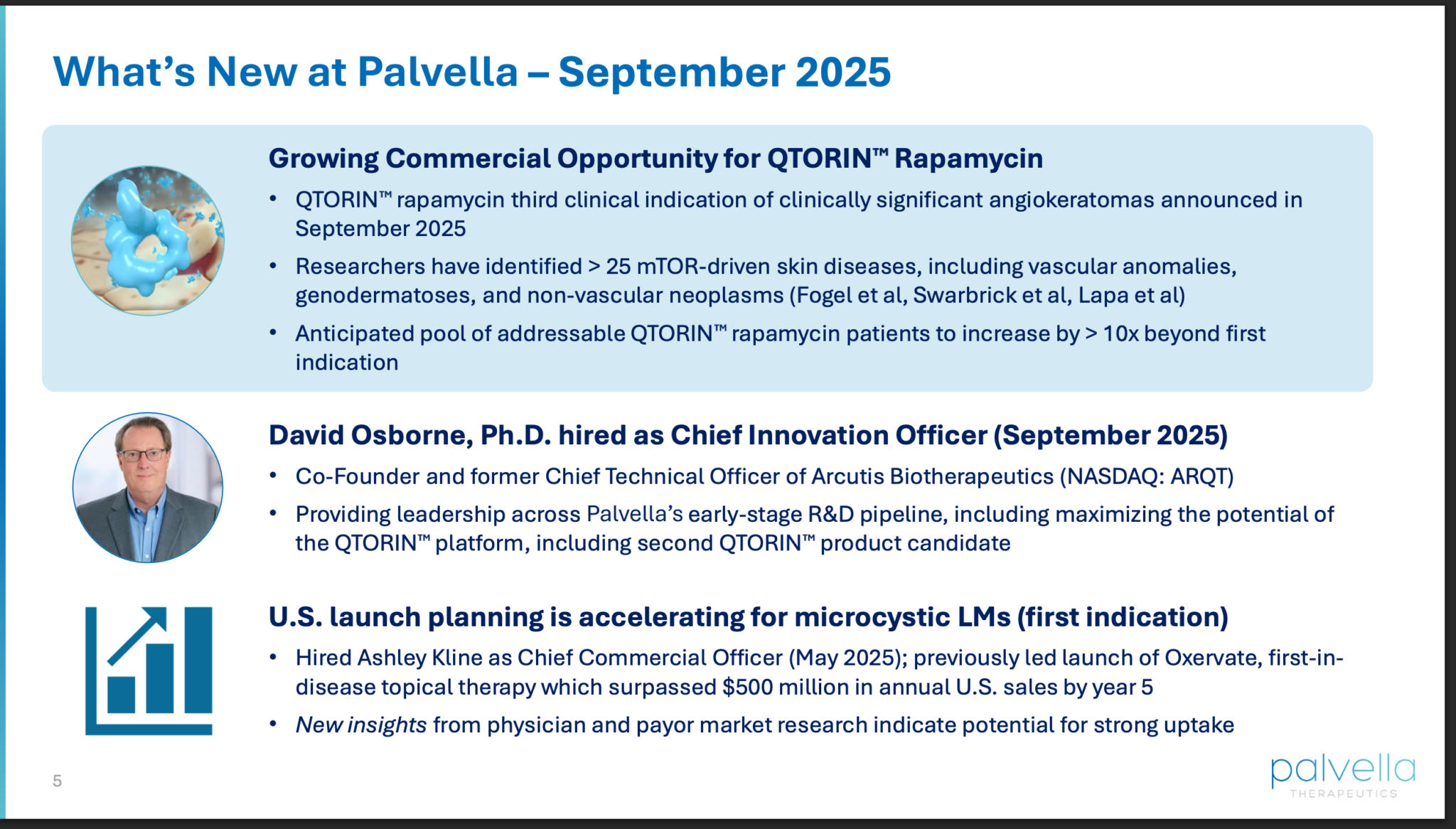 Palvella Therapeutics is a clinical-stage biopharmaceutical company focused on developing and commercializing novel therapies to treat patients suffering from serious, rare genetic skin diseases for which there are no FDA-approved therapies. Palvella is developing a broad pipeline of product candidates based on its patented QTORIN™ platform. Palvella’s lead product candidate, QTORIN 3.9% rapamycin anhydrous gel (QTORIN™ rapamycin), is currently in clinical development for microcystic lymphatic malformations (microcystic LMs) and cutaneous venous malformations.