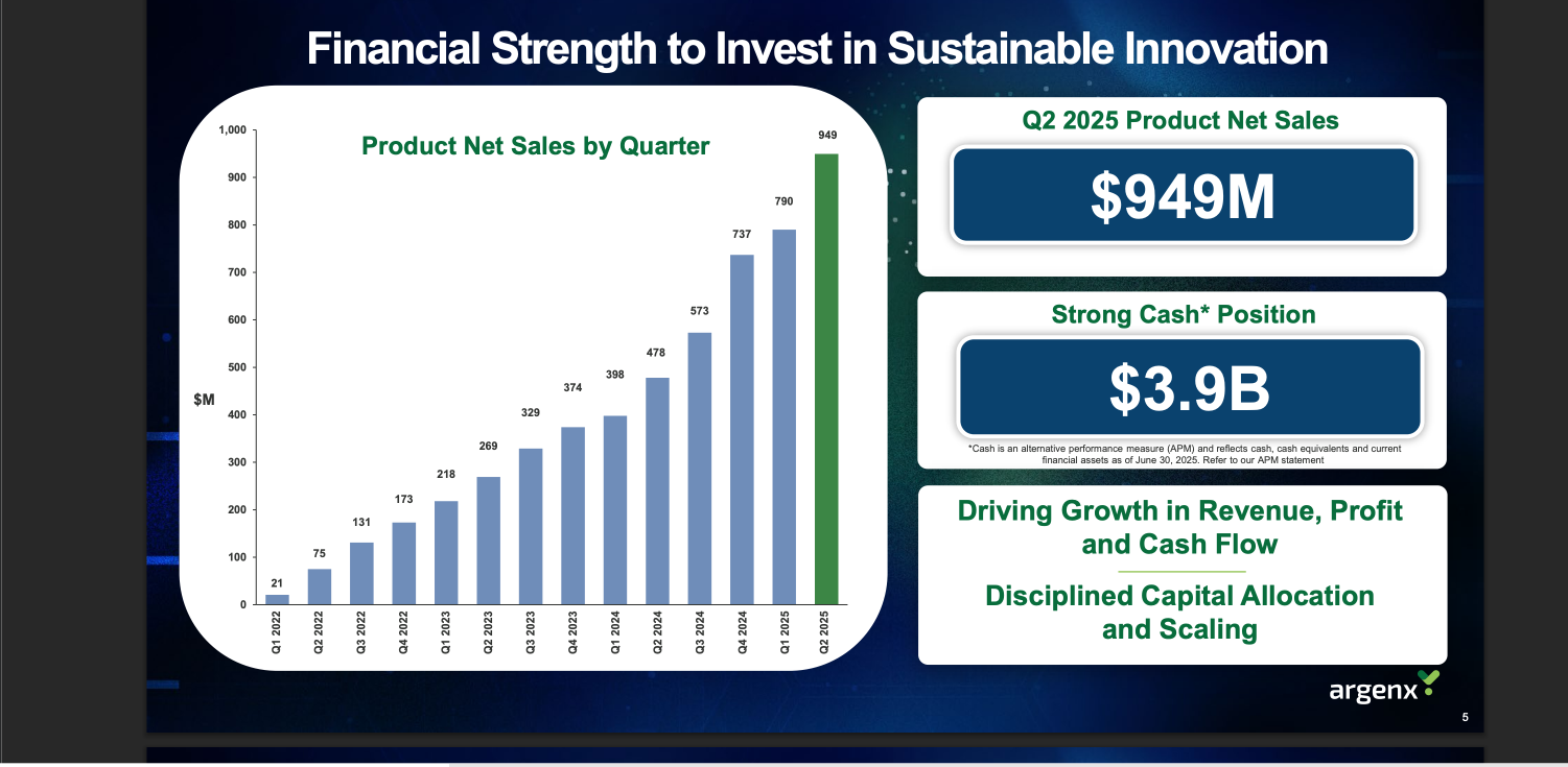Let’s look first at the patients on treatment. In the latest quarter, Q2 2025, ArgenxSE reported sales not much short of $1bn. This continues a period of strong growth.