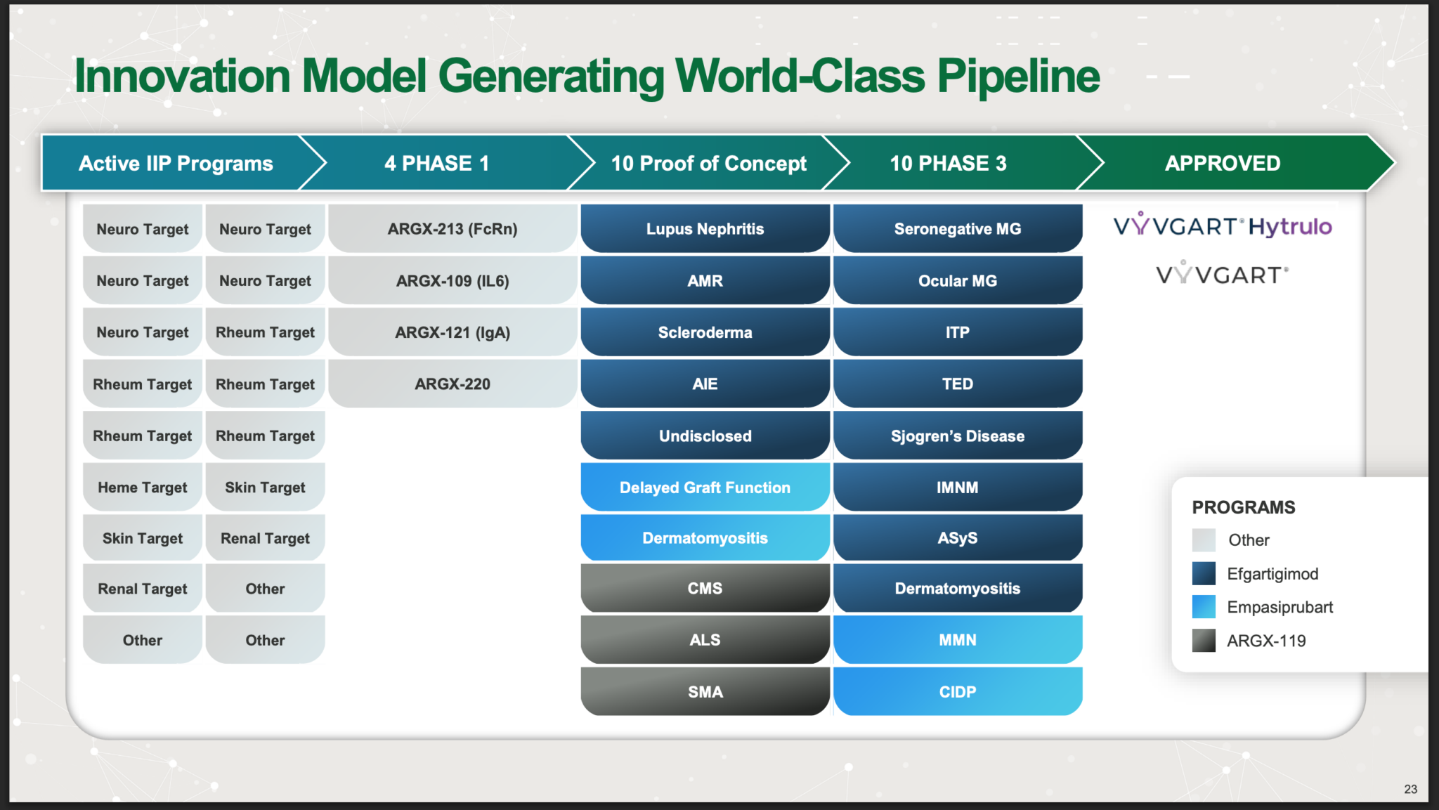 Further along, Argenx has 10 drugs in phase 3 trials.