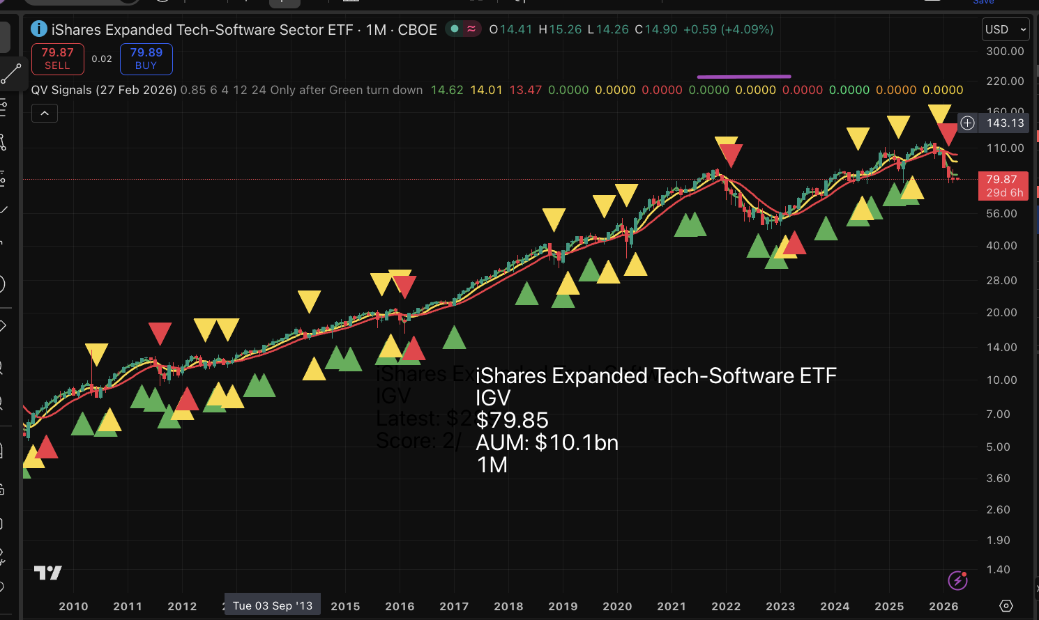 The iShares Expanded Tech Software ETF (IGV) has a negative chart, with all the moving averages declining. There was a trendline breakdown around $100, with no sign of a reversal higher. Software stocks are under particular pressure from the AI revolution, but the chart is symptomatic of patterns across the stock market.