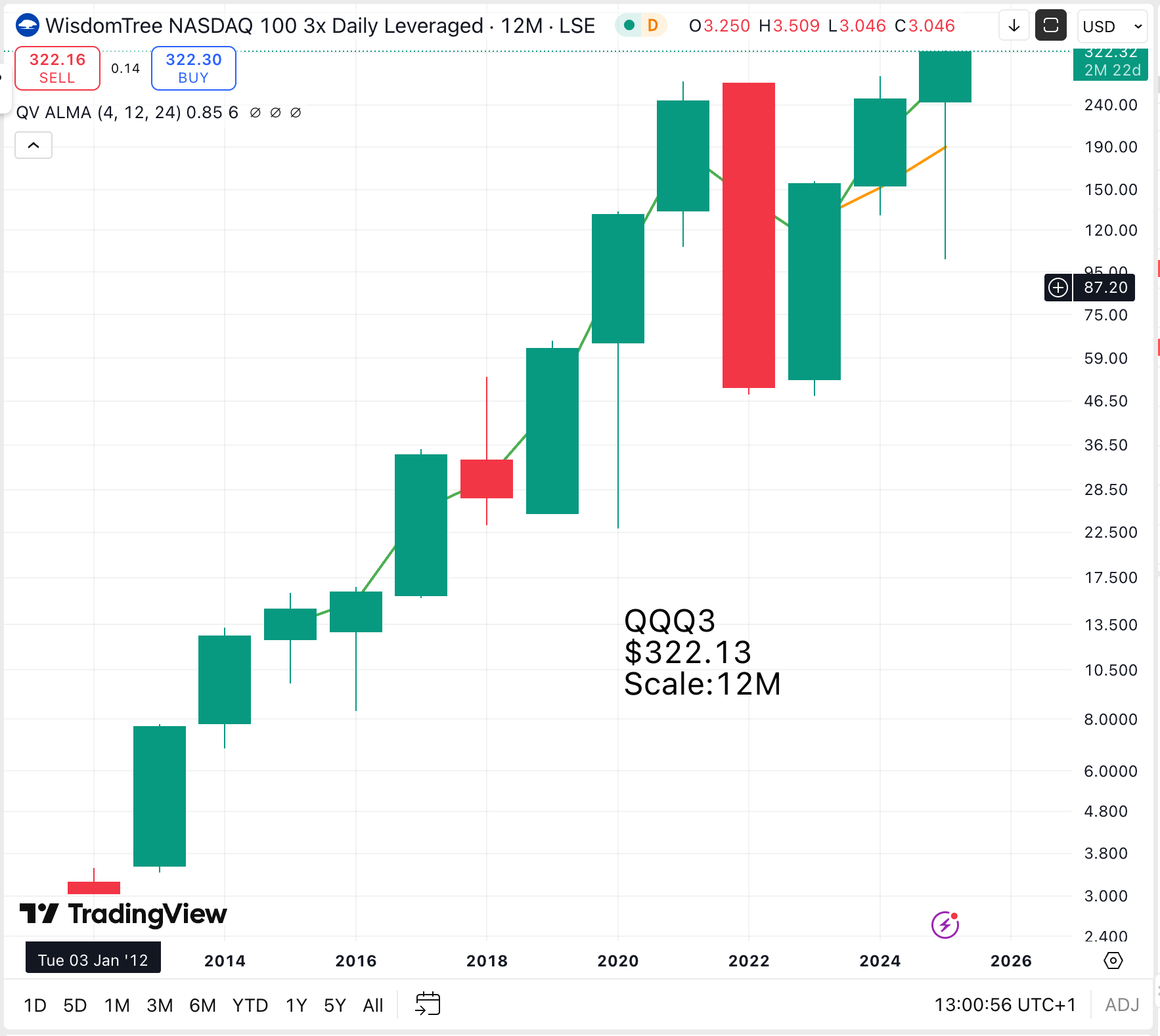 This is an epic chart and sets the scene for a massive extension of the bull market in US stocks in the coming years. Another leveraged ETF, TECL, looks the same, as do some of the mega caps, for example, Nvidia, Microsoft, Meta Platforms, Alphabet, Taiwan Semiconductor and Broadcom have great charts and other Tech Titans like Apple and Tesla are simmering. The conditions are in place for an epic charge in share prices. There is also what some are describing as the stock market’s secret weapon, $7 trillion, sitting in money market funds. A significant fall in interest rates, combined with a charging US bull market, could bring money flooding into stocks.