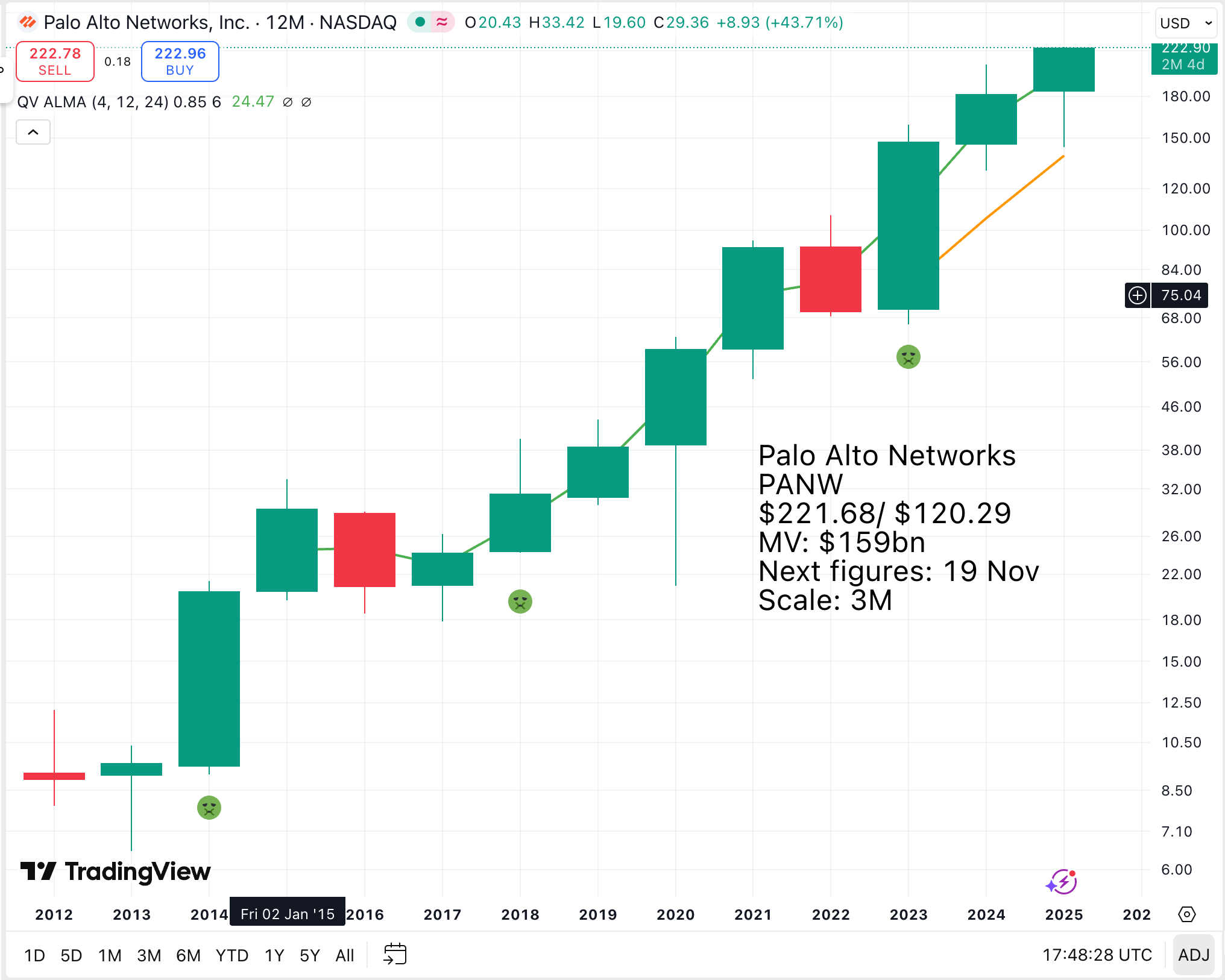 I have a long way to go to fully grasp the journey Palo Alto is on, but I have seen enough to convince me that it is an exciting one. Incidentally, Palo Alto looks outstanding on a 12M candlestick chart. The shares will be added to the Top 40 list, which is now 47 shares.