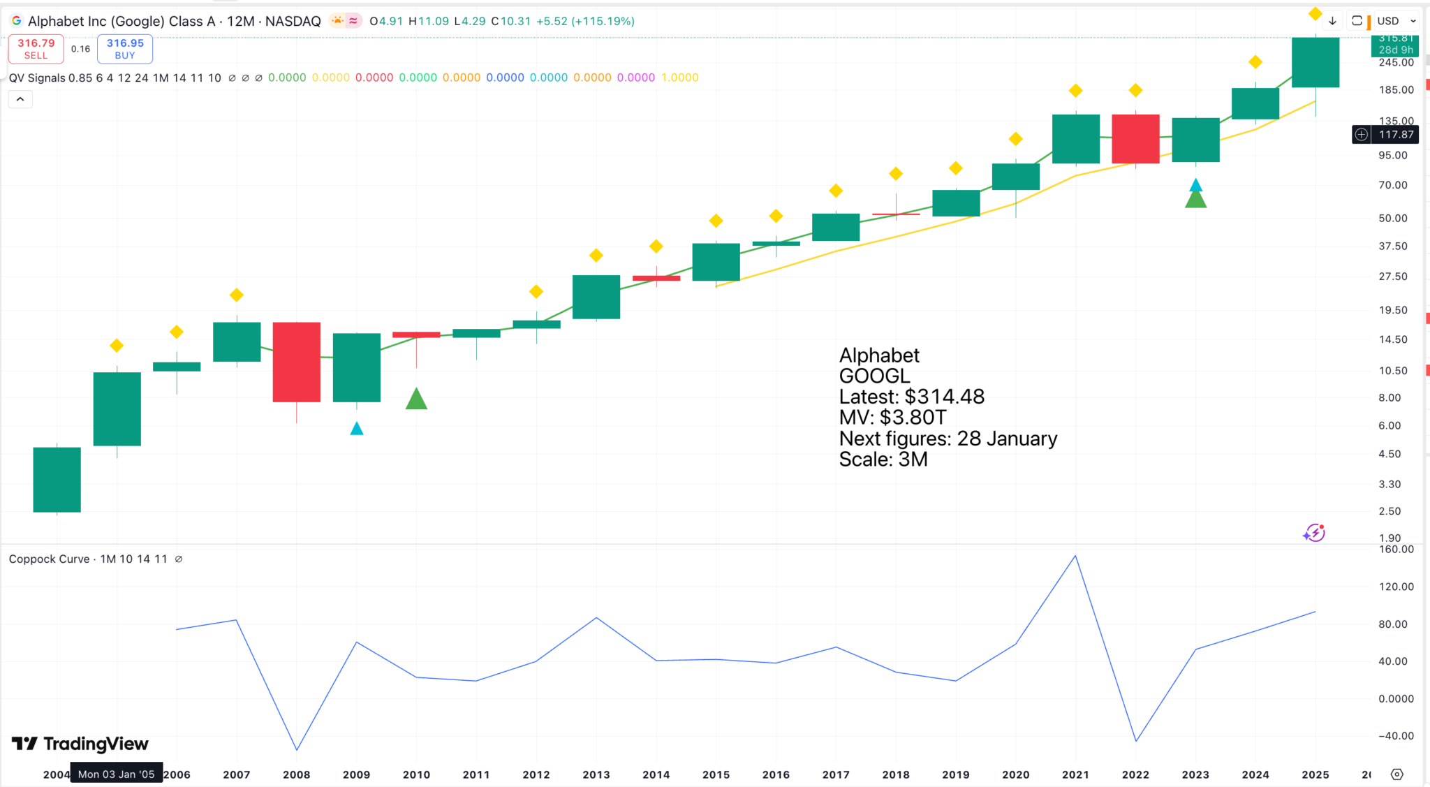 The slope on the chart may look gentle, but in just over 20 years, the price has risen from $2.40 to $316! All the indications are that Alphabet is still full of vigour and as innovative as ever, while possessing businesses that throw off a tidal wave of cash.