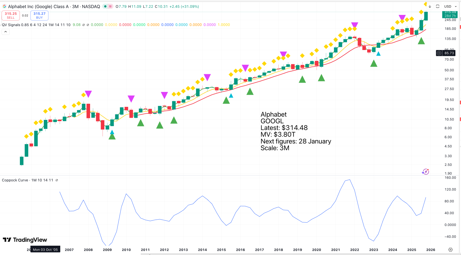 There is a case for saying that the recent price action, which resembles that seen when Alphabet first floated, is a new chart breakout and that a sustained period of rising prices lies ahead. This would make sense if AI is going to make everything Alphabet does more valuable to its customer base.