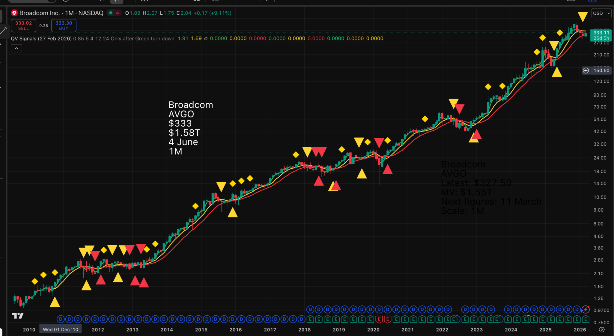Fact 3 – So, what about the chart? The yellow line is falling after a recent sell signal, but it is more a question of flatlining. Broadcom shares would look like a strong buy on a yellow line buy signal. I will be alerted to this as soon as it happens.