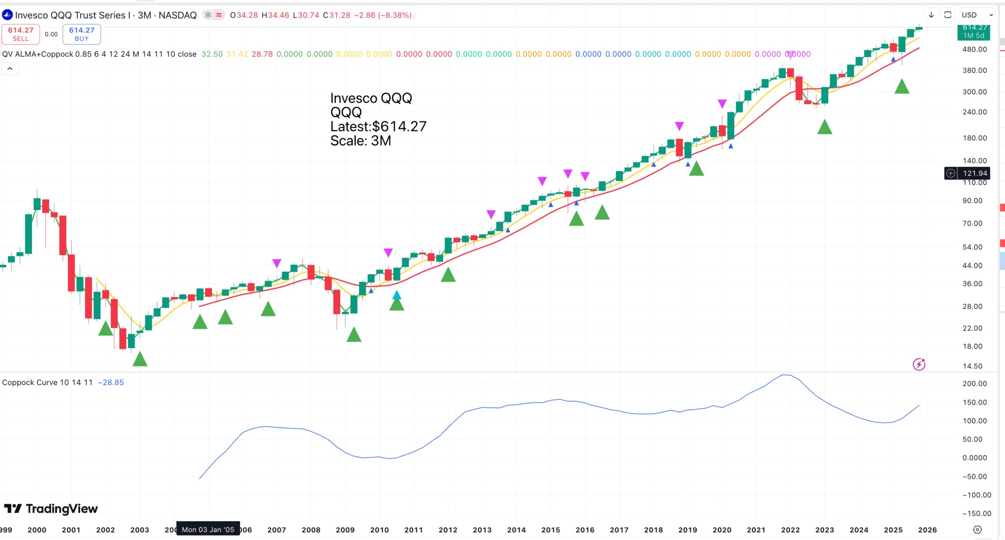 QQQ is moving higher after a strong double whammy buy signal (moving averages plus Coppock).