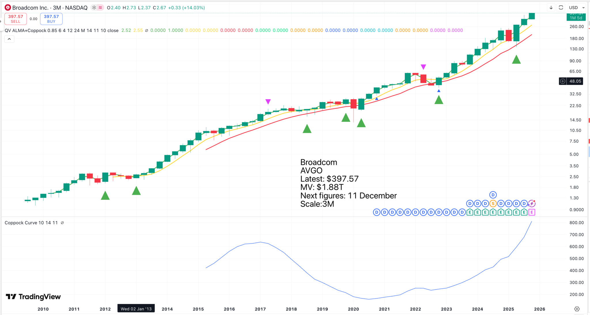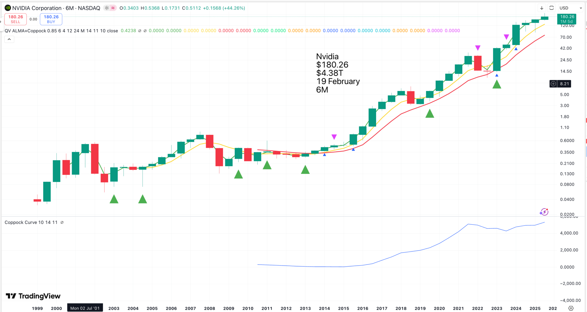 This is a 6m candlestick chart. Coppock only kicks in after 11 years, but it would have signalled the two massive downturns in the first decade of the new millennium. It signalled sell in 2022, which looks small on the chart, but peak to trough, 21-22, Nvidia lost two-thirds of its value, so not a bad time to stand aside.