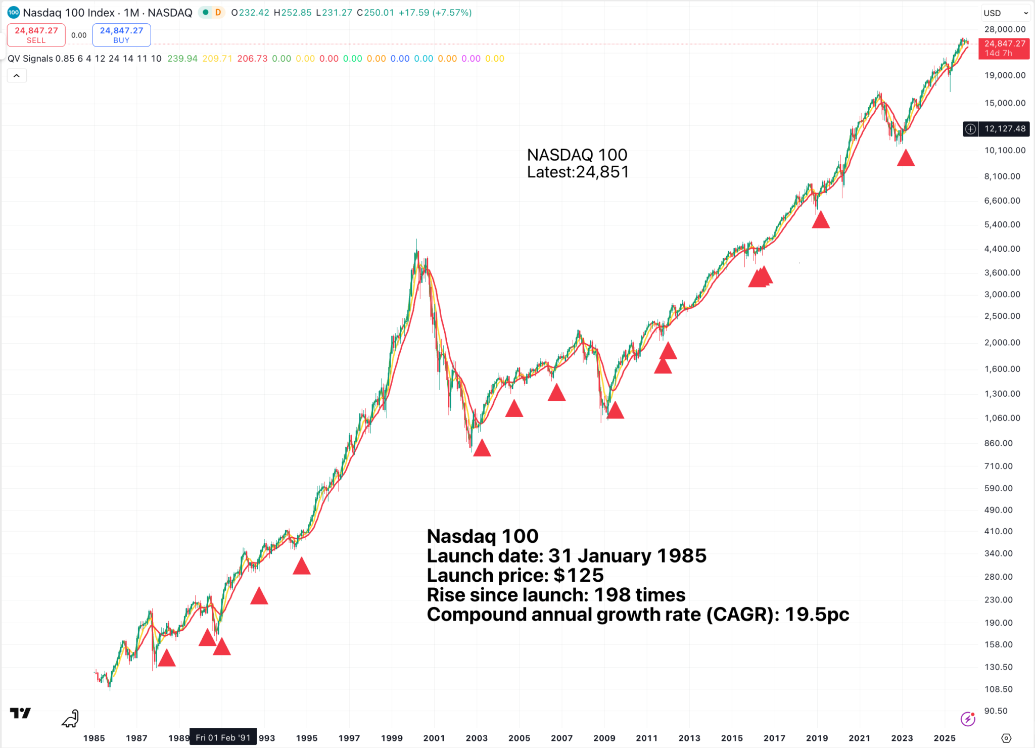Before I talk about red line investing, take note of the performance of the Nasdaq 100 index since it was created in January 1985. It is up nearly 200 times and has been compounding annually at a rate not far short of 20pc. This is a staggering performance.
