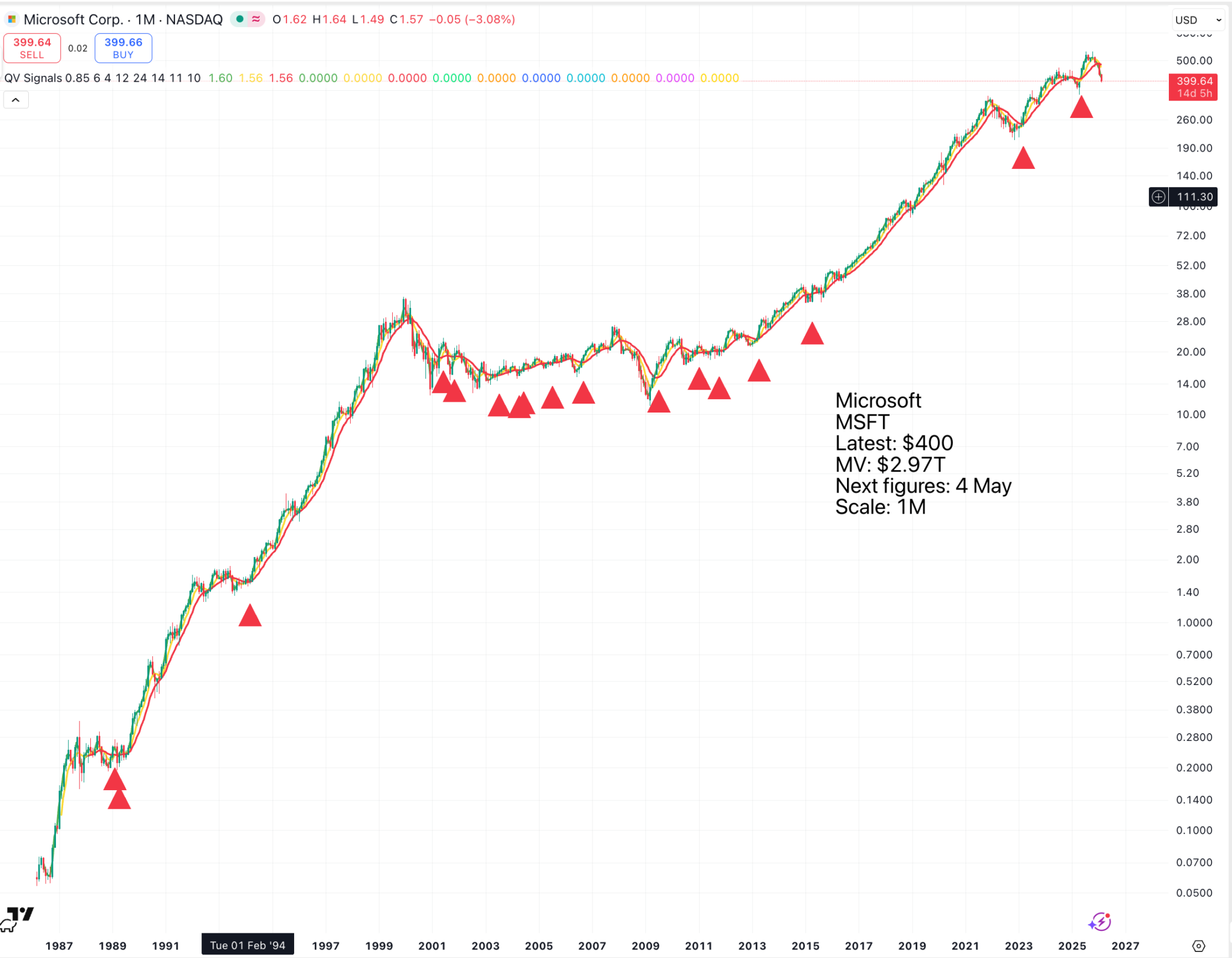 The Microsoft chart does not look so good, though, after such a sharp decline, they are oversold. The red line has turned down, indicating a significant loss of momentum in the shares. Past buy signals have been excellent. There was a long period of bunched signals when investing in the shares would have been dead money. Again, the trick was to wait for a decisive move to a new high.
