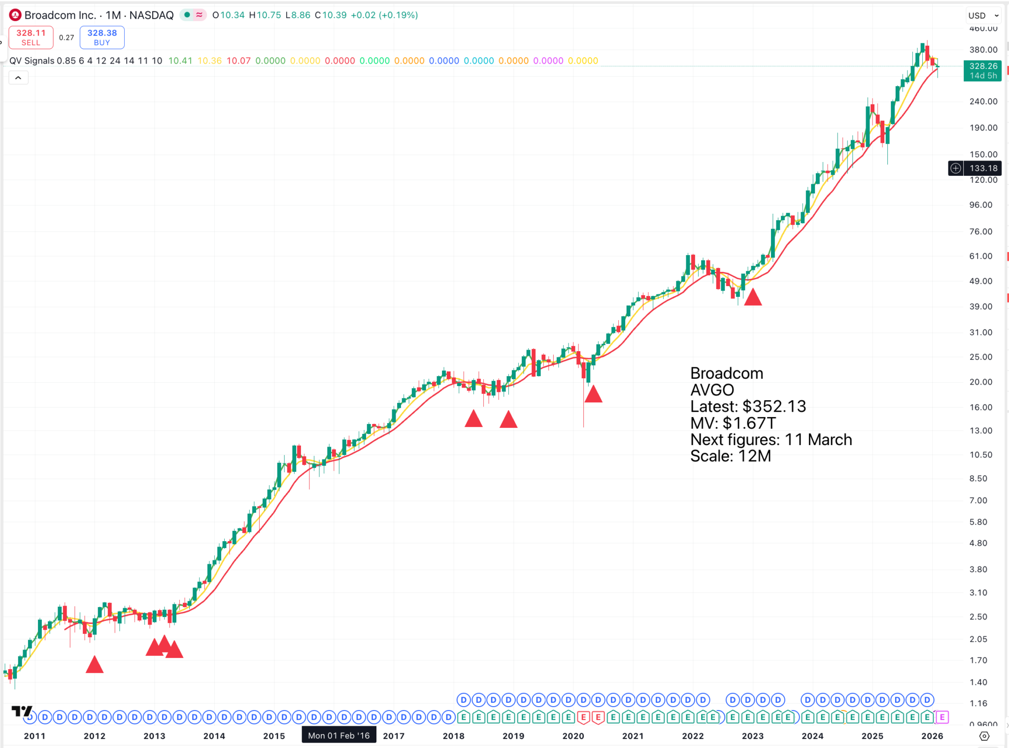 Broadcom (AVGO) is in such a strong uptrend that there have been few red-line buy signals over the last 15 years. A shorter-term buy signal is given when ALL three moving averages rise in tandem after a period in which one or more have been declining. At the moment, two of the moving averages are declining, so, on this basis, Broadcom shares are not a buy.