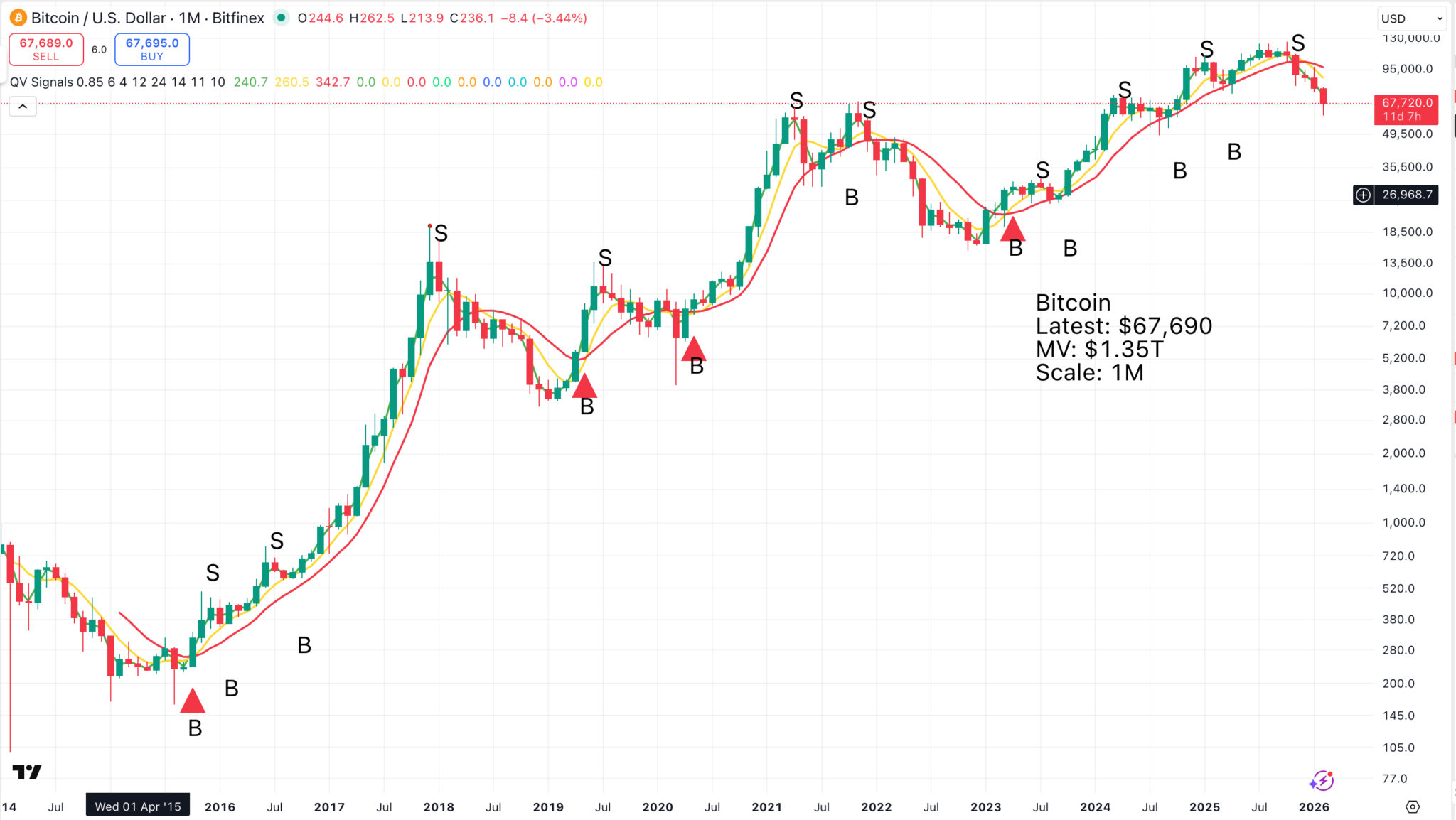 Red line investing is based on my longest period moving average, which is a red one. On this chart, we are particularly concerned with buy signals. As you can see, they are good with the signal, repeatedly, followed by a sustained rise in the index.