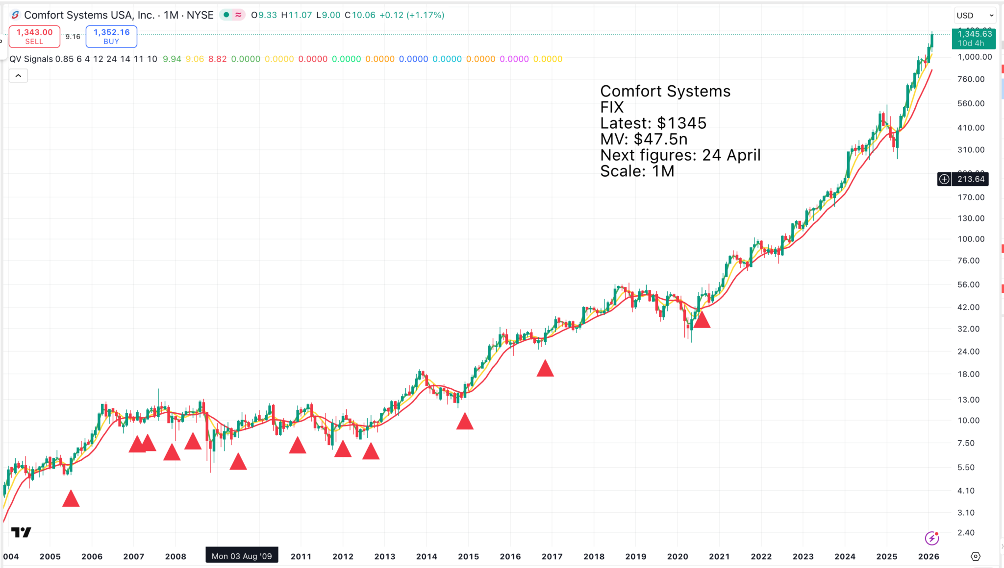 The shares that are suffering are the momentum plays. The growth in data centre spending is on such a massive scale that many companies are benefiting, so plenty of shares looking good have not attracted the same attention from momentum investors. Comfort Systems supplies the plumbers and electricians who are needed to make the data centres work. The company’s secret sauce is an endless stream of value-adding acquisitions. As you can see, the last major buy signal was a long time ago, but it was a very good one.