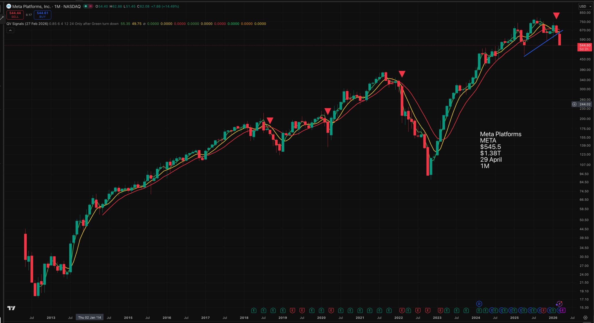 This is an alarming chart for Meta Platforms. We have a red-line sell signal, a broken trend line, and a breakdown from a top area. Meta Platforms is a bellwether stock and a huge spender on AI and data centres.