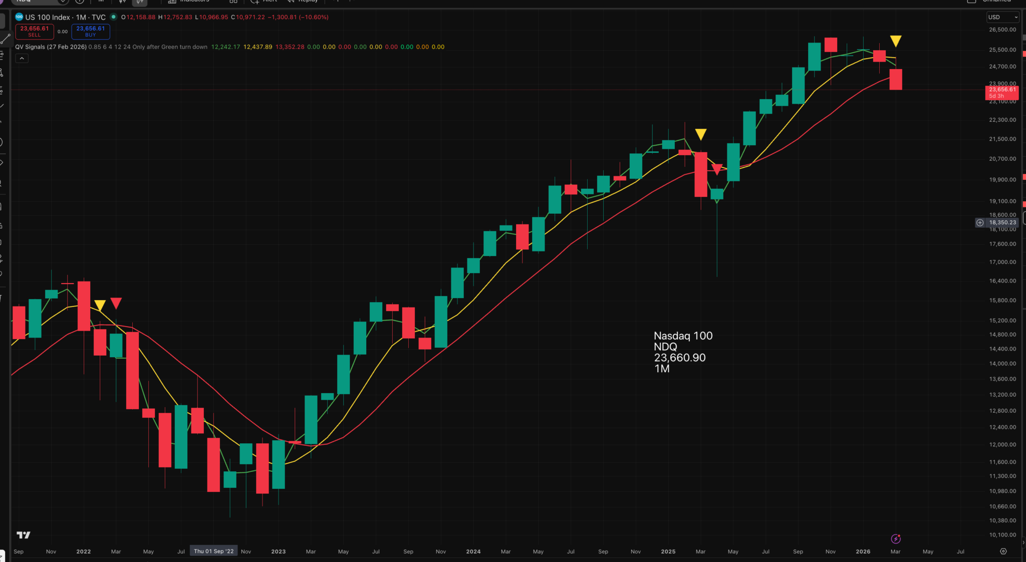 The chart for the Nasdaq 100 also looks unhappy. We don’t yet have a declining red line, but the uptrend has broken, and a yellow sell has been signalled. The message is that this is a dangerous market vulnerable to negative shocks.