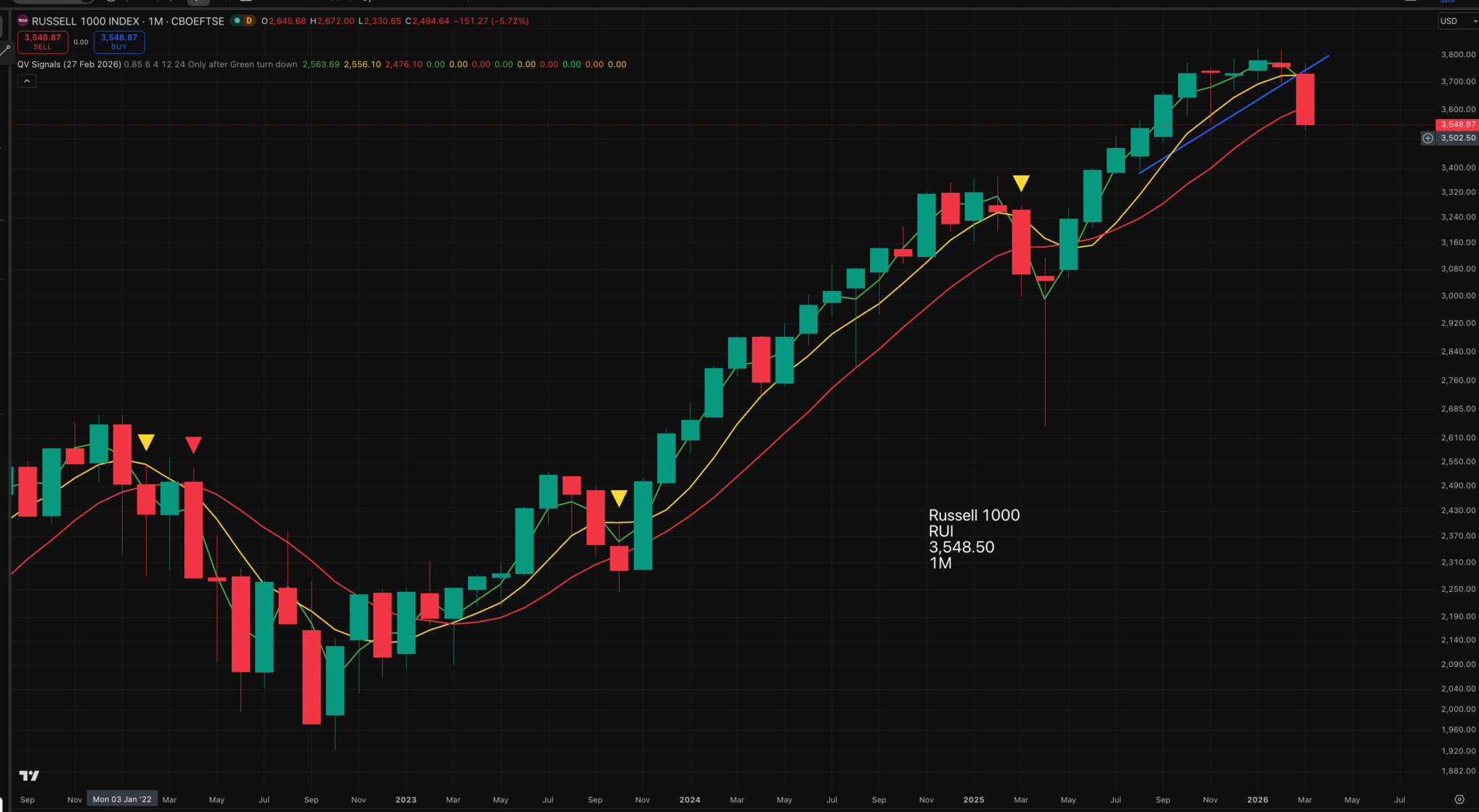 The Russell 1000 is an index of the 1,000 largest US stocks, considered suitable for institutional investment. The uptrend line has been broken, and a yellow sell signal is a whisker away. The latest month’s price action looks like a breakdown.