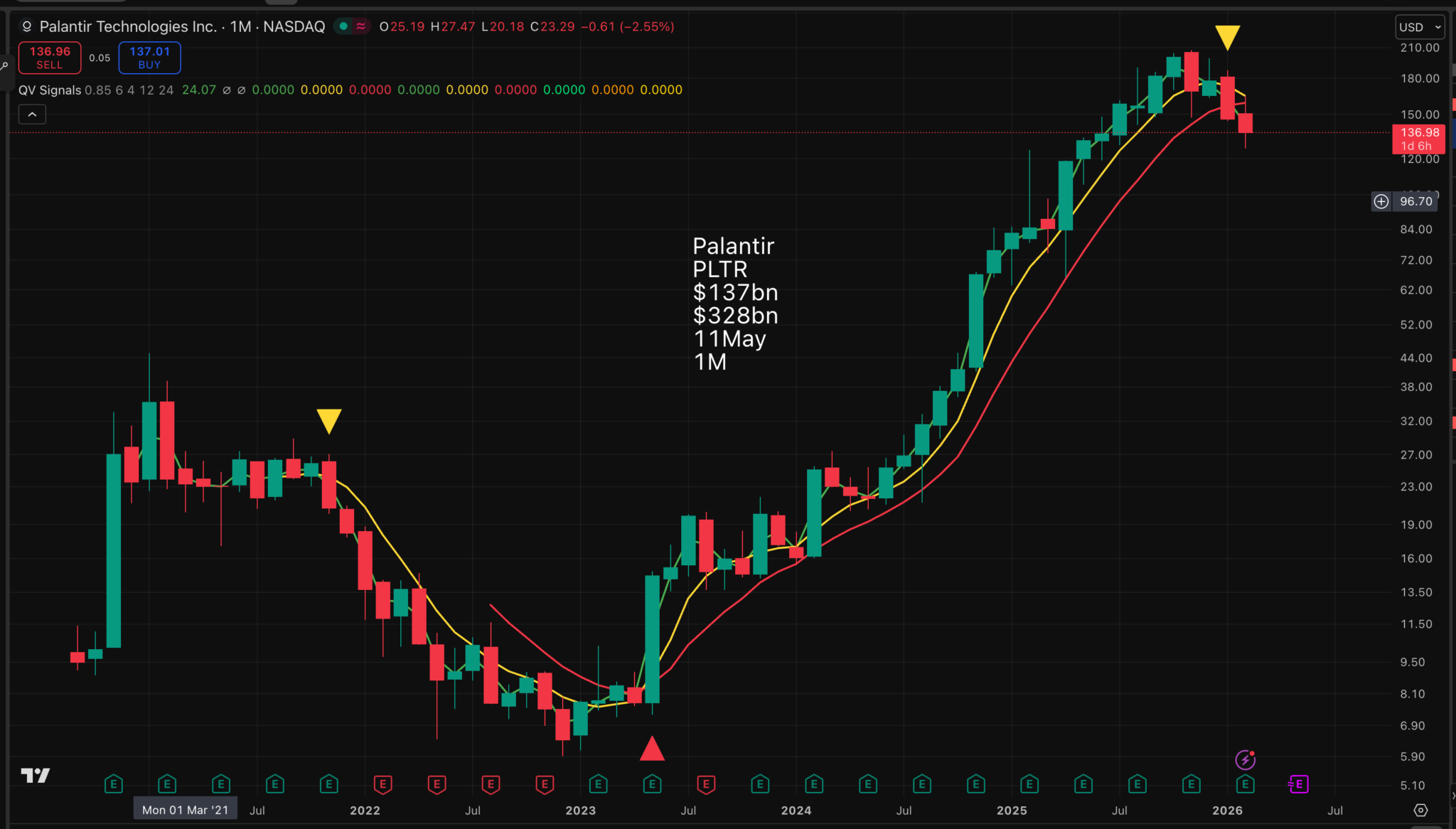 Palantir is in a similar position to Nvidia with even more breathtaking fundamentals but the chart has deteriorated further.