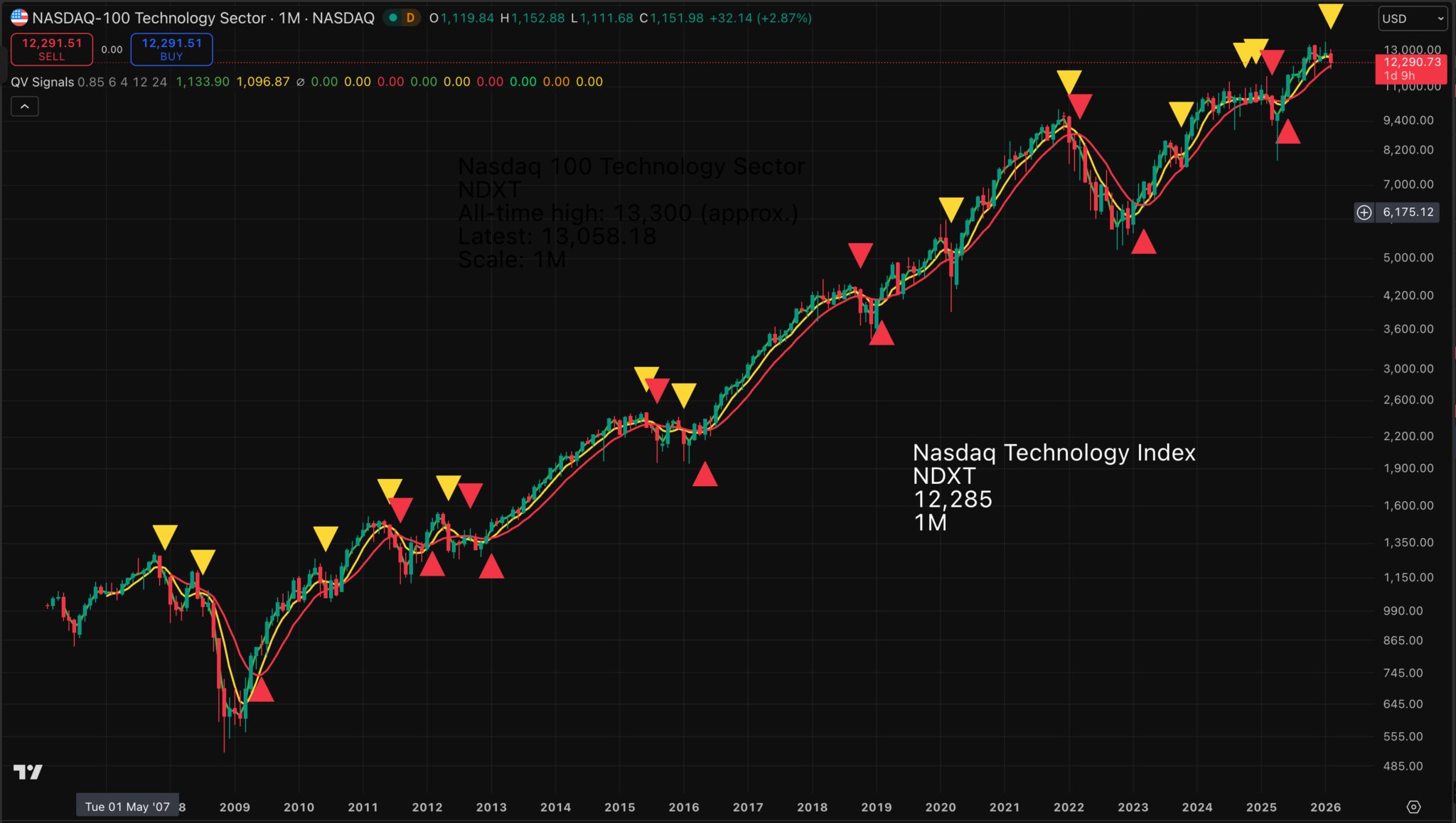The Nasdaq Technology Index is beginning to look similar with a sell signal from the yellow moving average.