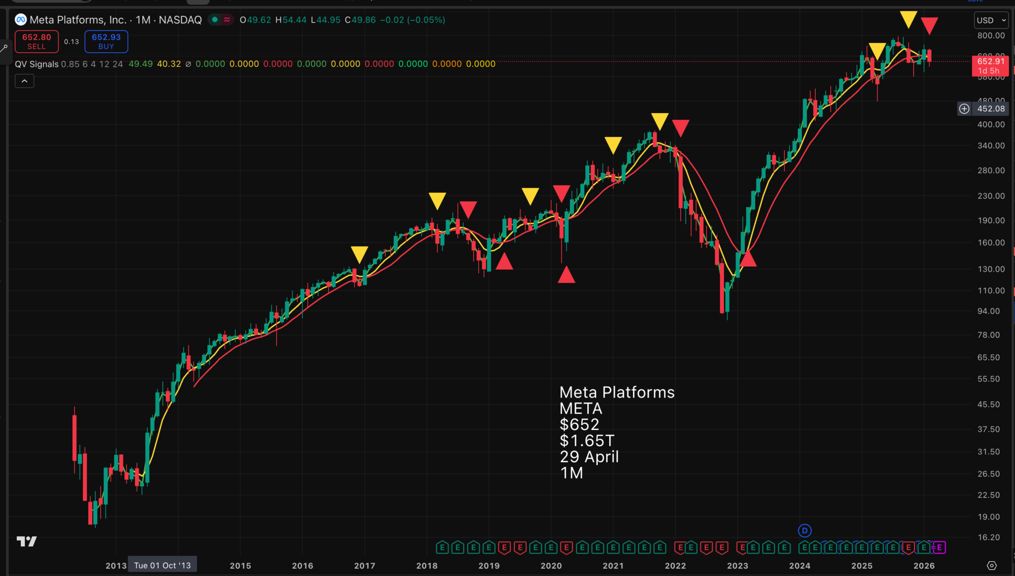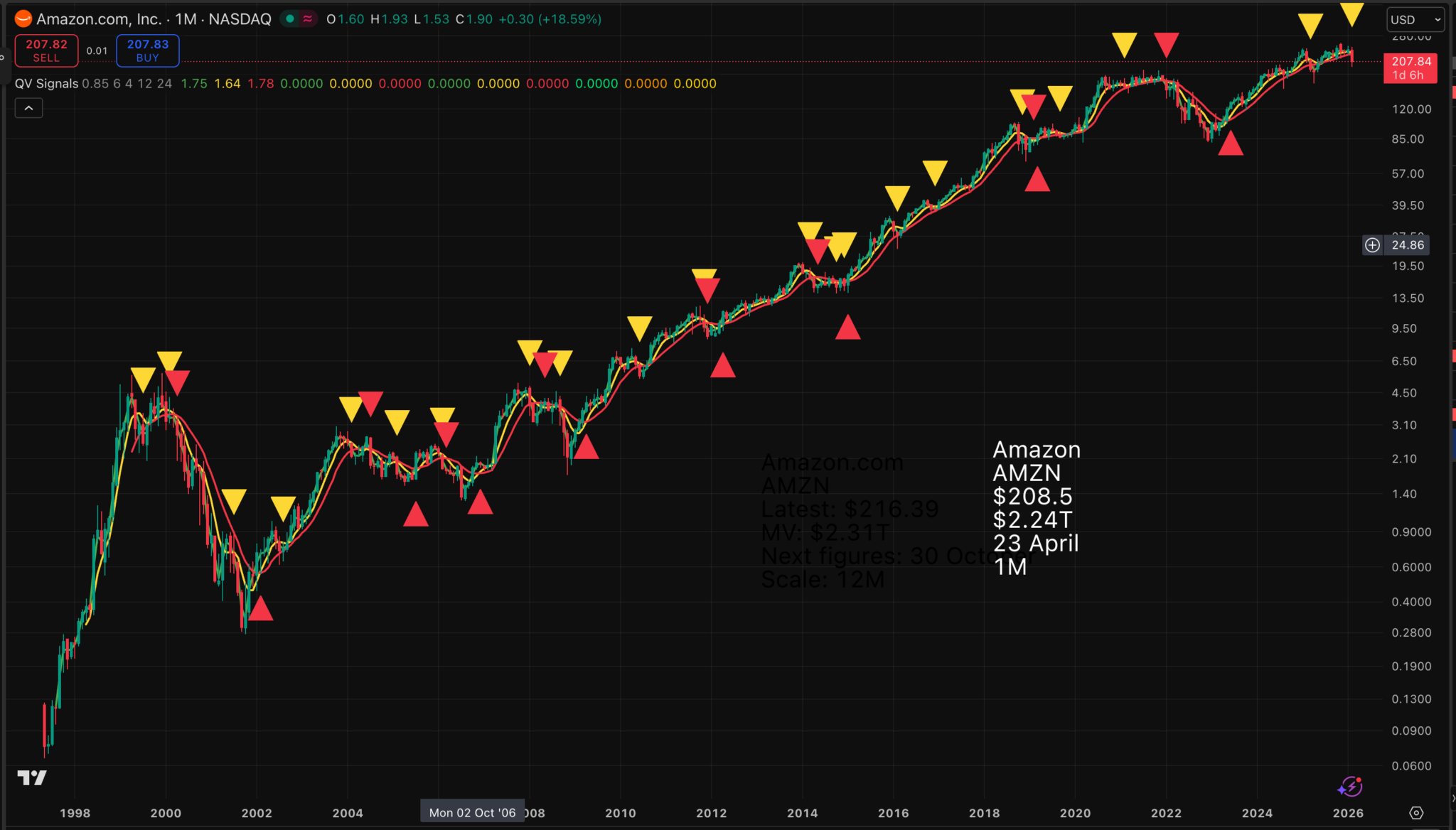 What is striking on the Amazon chart is how well the red line buy signals have worked. The problem with these signals is their scarcity, but when we do have one, they are usually rewarding. A simple strategy for this chart would be to buy on a red line buy signal and sell on a red line sell signal. It looks like a license to print money, at least for this chart.