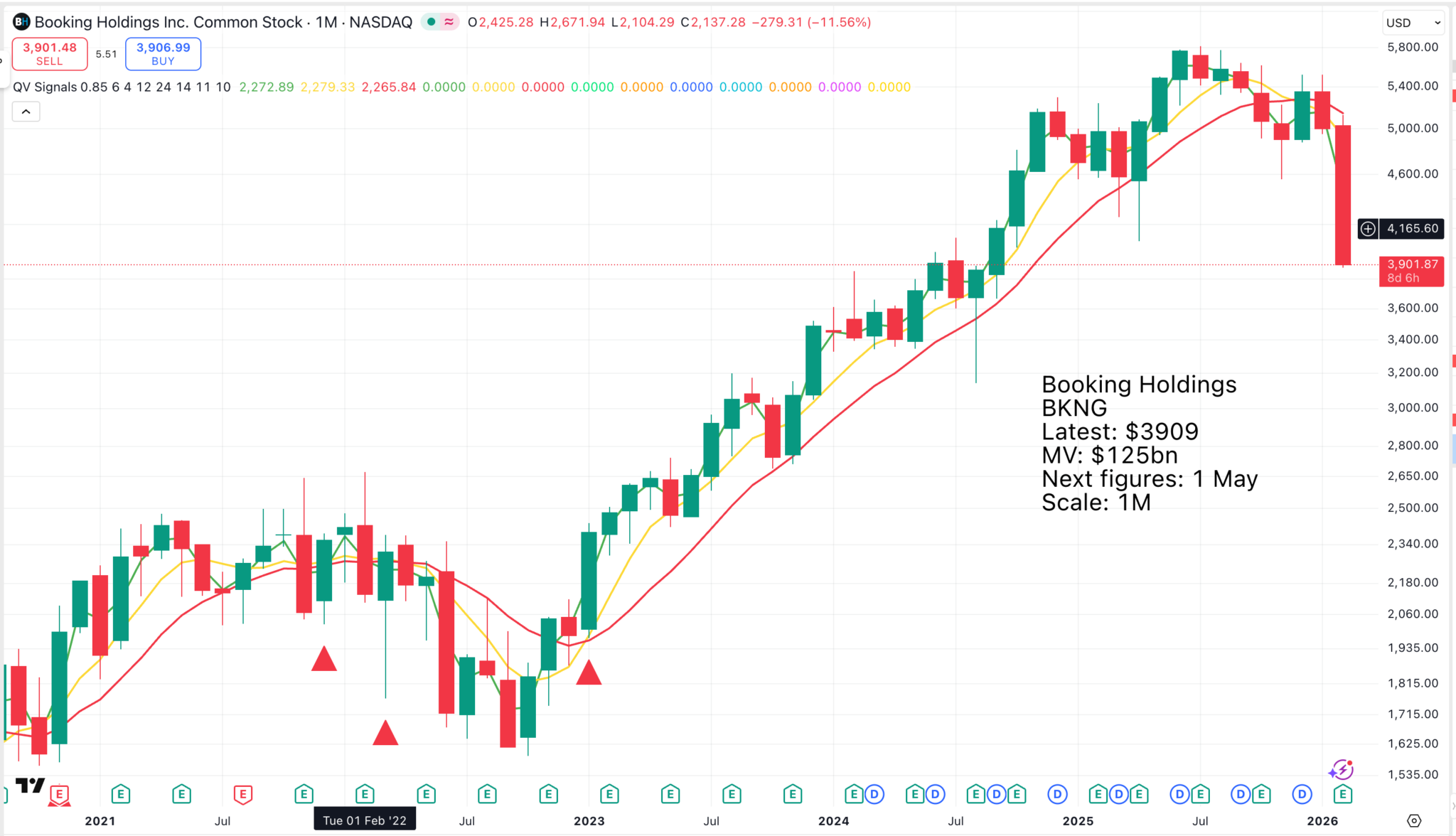Shares in Booking Holdings had been steaming ahead since an epic red line buy signal in January 2023, but not anymore. Most recently, the moving averages have bunched and broken down sharply. Below is a snapshot explanation for the decline.