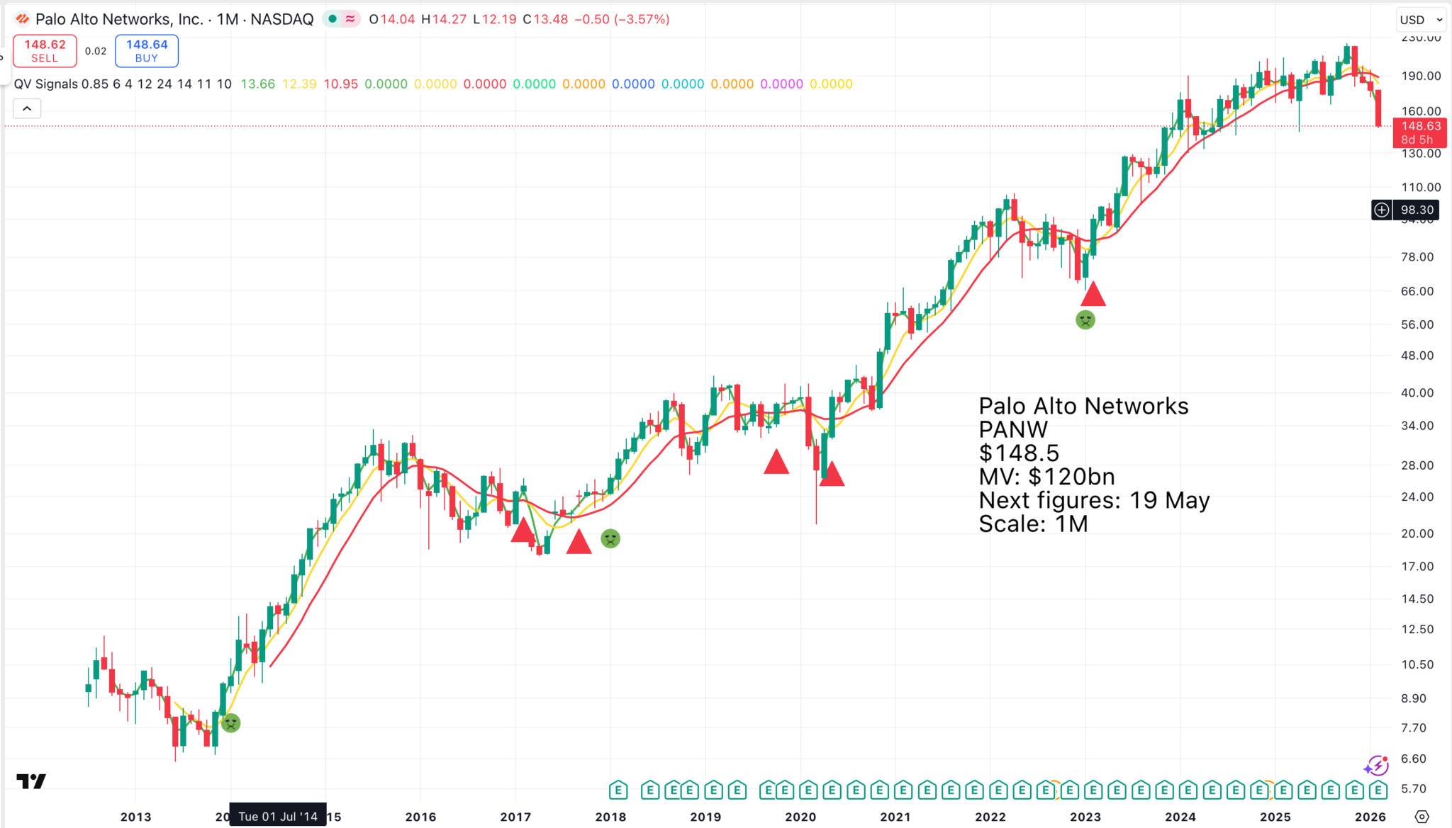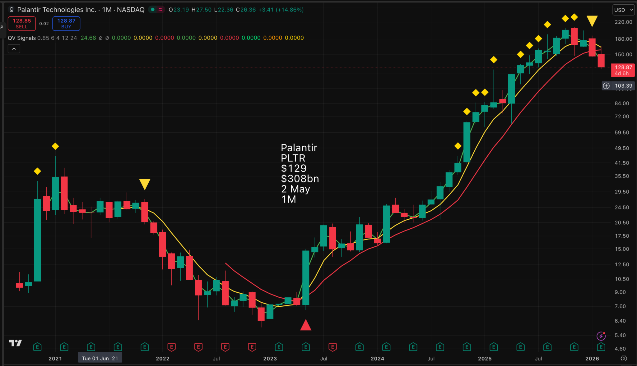 Companies like Palantir have a special problem because many investors are along for the ride and will jump ship if the helter-skelter is dipping. My reading of this chart is that Palantir shares might be a great buy, but with my chart hat on, they look frighteningly vulnerable.