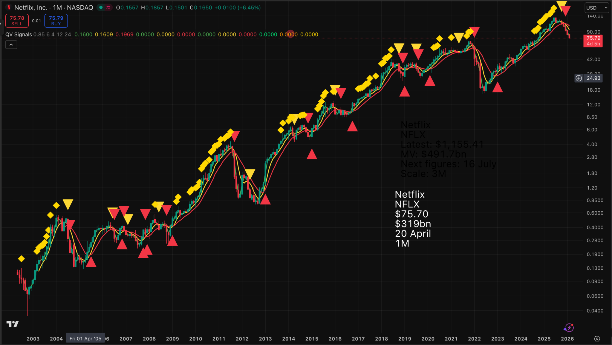 They have bounced sharply in recent days, but the all-important red line m/a is falling on this Spotify chart. The last time that happened was a blood bath. The Netflix chart looks similar.