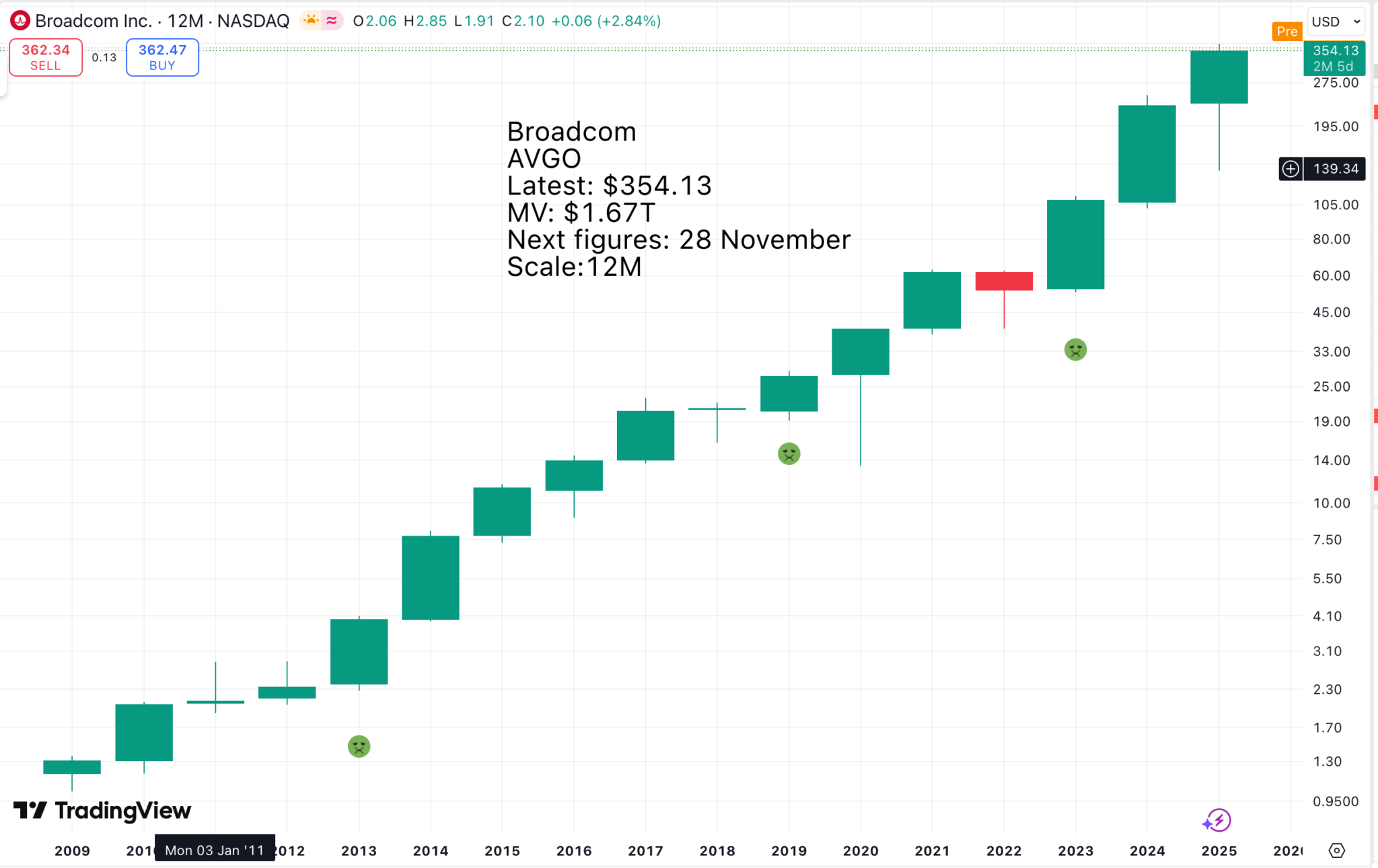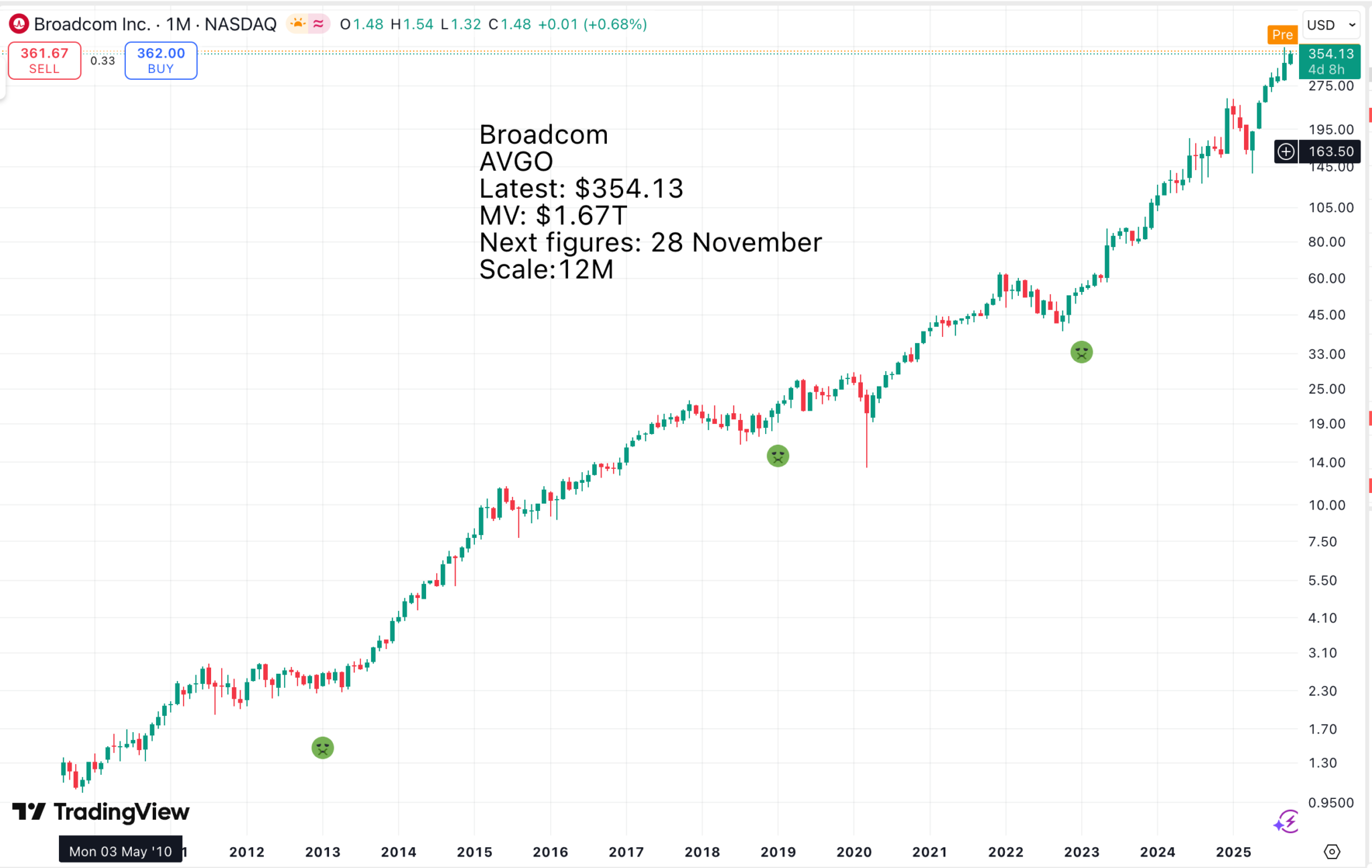 Broadcom is perfect 3G. It has a great long-term chart, it is growing rapidly (latest sales rose 22pc with EBITDA up 30pc and AI semiconductor revenue up 63pc), and it has a great story with across-the-board exposure to the technology boom and a history of successful acquisitions.
