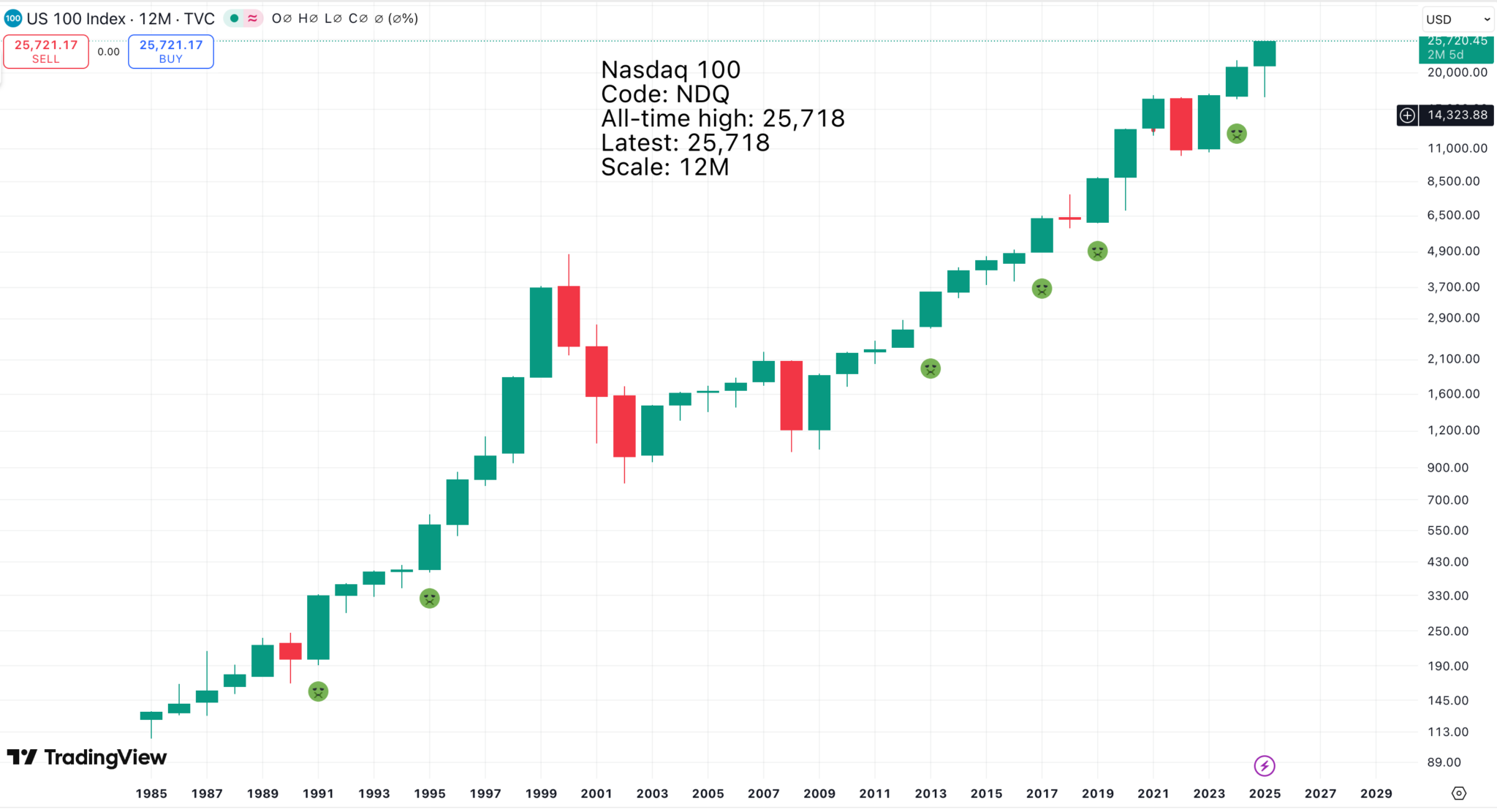 I have marked in the obvious buy signals on a long-term chart of the Nasdaq 100. The most important buy signals follow a consolidation which contains a red candlestick. This suggests we are early in a big move – exciting times for investors!