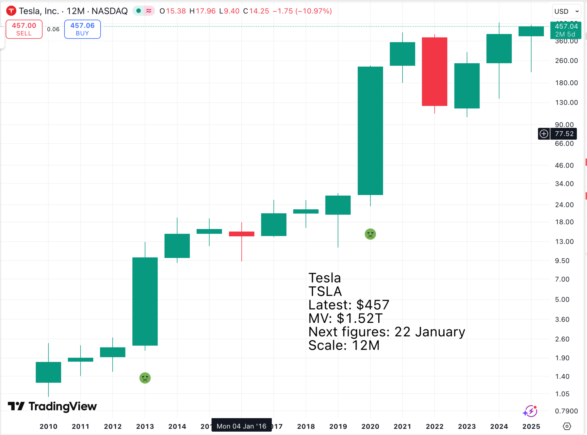Like Palantir, Tesla is already in my Top 40 List but this chart is looking very promising. It doesn’t quite qualify for a green smiley buy signal but it is close. Tesla has sold a lot of cars but the share price drivers are surely more to do with what is coming, self-driving cars and their pedestrian counterparts, robots.