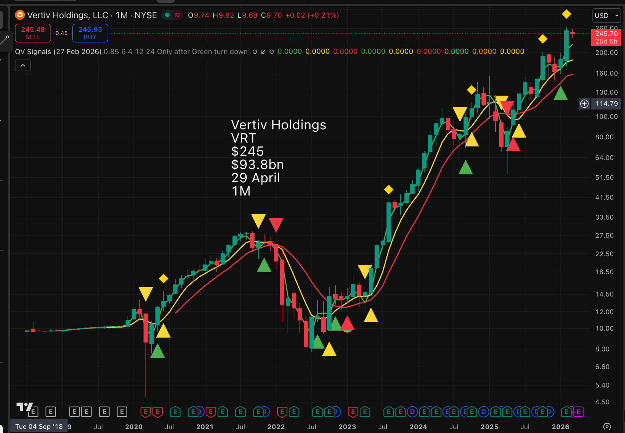 The signals for Vertiv have been buy, sell, buy, sell, buy and finally buy more. Currently, you would be holding the shares. The fundamentals are exciting. Buy and hold would work well with this share or dollar cost averaging. If you are trading shares, it might be best to do this in a spread betting account to avoid tax problems.